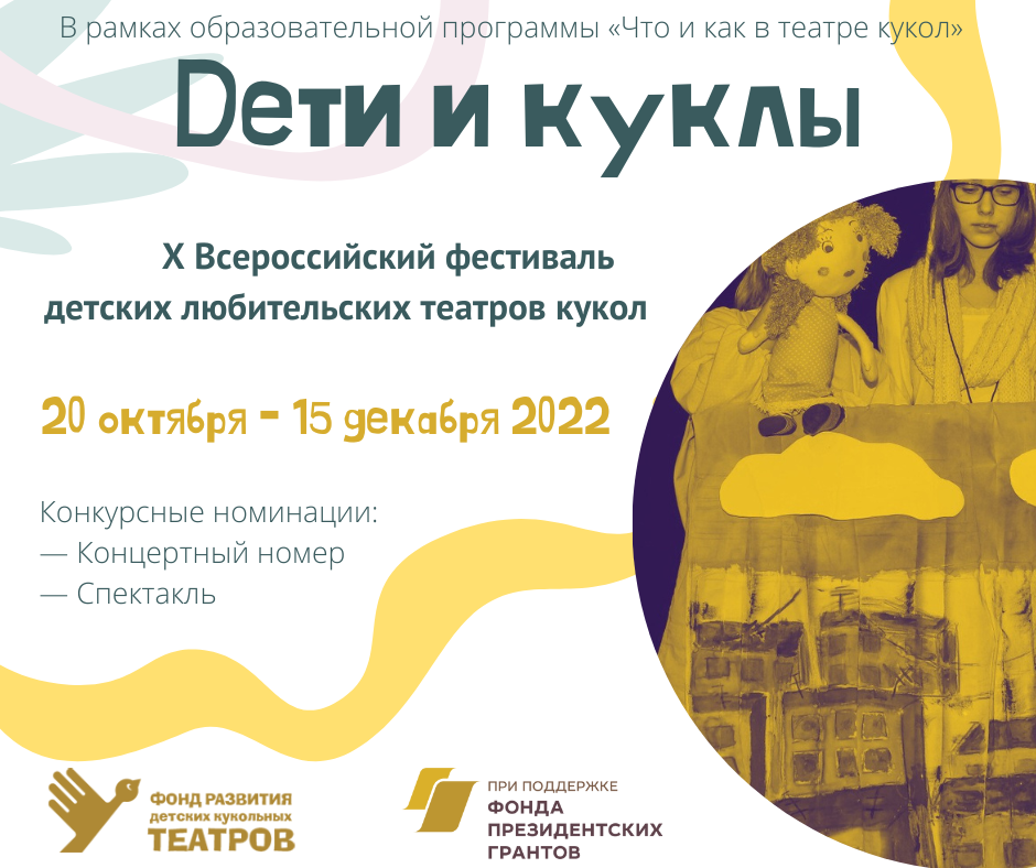 Фонд развития детских кукольных театров приглашает юных кукольников в возрасте от 4 до 99 лет принять участие в X Всероссийском фестивале детских любительских театров кукол «Дети и куклы». Прием заявок проводится с 20 октября по 4 ноября 2022 года включительно. Подача заявки будет проходить онлайн на этой странице.